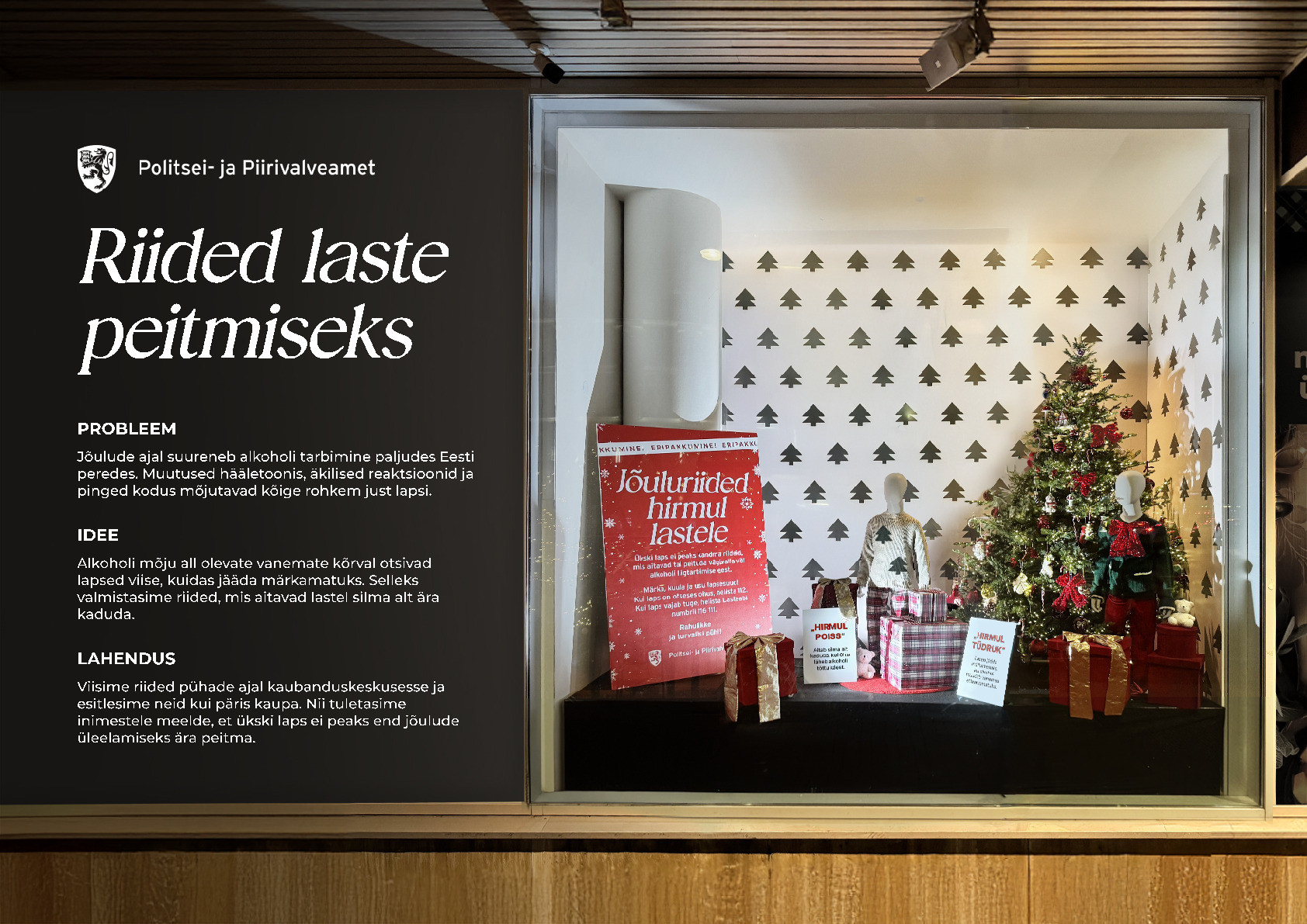 Jõulude ajal kasvab paljudes Eesti peredes alkoholi tarbimine ja kodune õhkkond muutub pingeliseks. Kõige rohkem mõjutab see lapsi, kes püüavad end valusatel hetkedel märkamatuks teha. Valmistasime lasteriided, mis aitavad end ära peita, ja esitlesime neid pühade ajal kaubanduskeskuses päris toodetena, et tuletada meelde, et ükski laps ei peaks jõuludel silma alt ära kaduma.