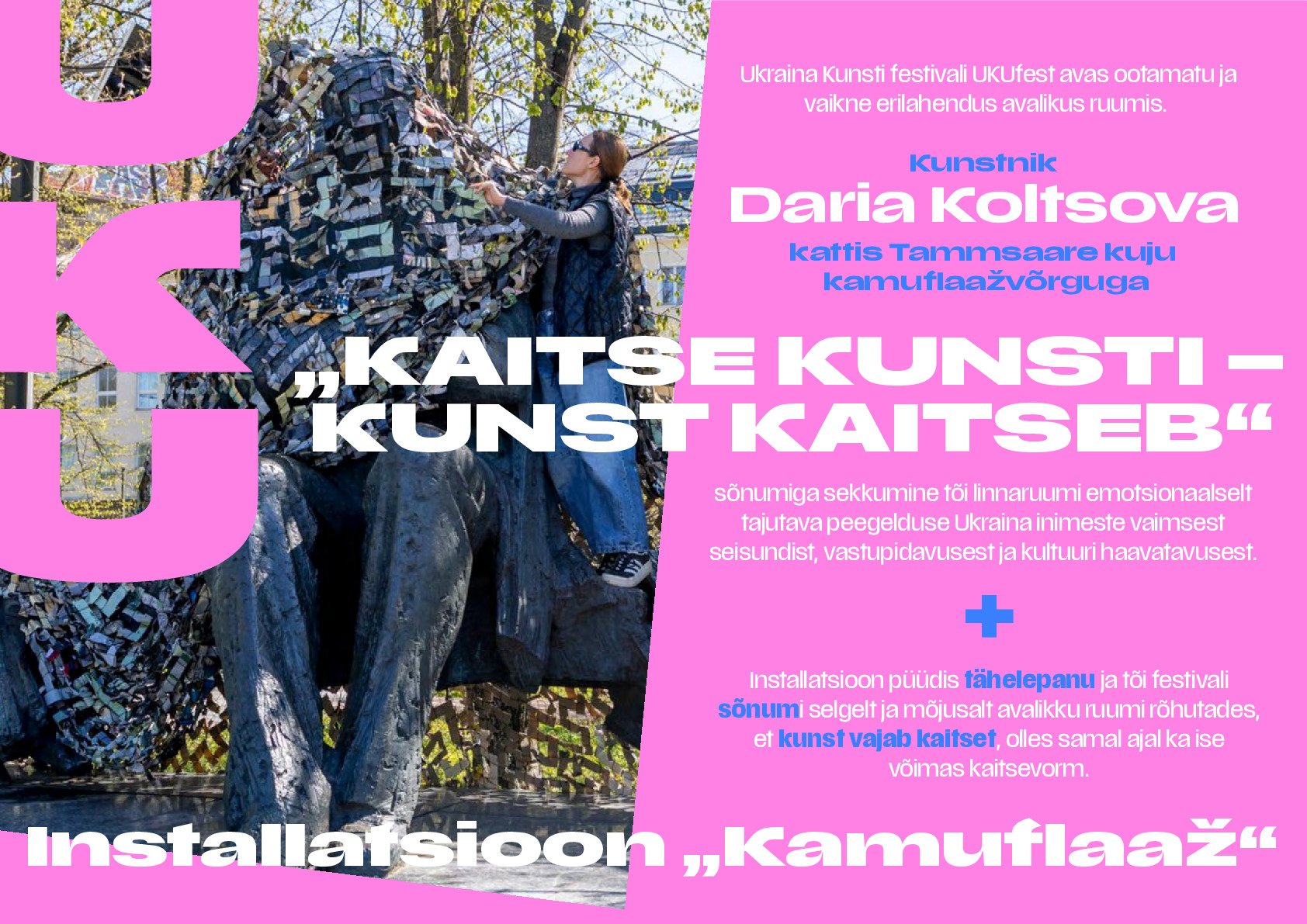 Esimest korda toimunud Ukraina Kunsti festivali "UKUfest" avas ootamatu erilahendus avalikus ruumis. Kunstnik Daria Koltsova kattis Tammsaare kuju kamuflaažvõrguga, mis oli loodud lahtilõigatud maalidest ja Eesti kunstnike annetatud teostest. „Kaitse kunsti – kunst kaitseb“ sõnum tõi linnaruumi emotsionaalselt tajutava peegelduse Ukraina inimeste vastupidavusest ja kultuuri haavatavusest.
