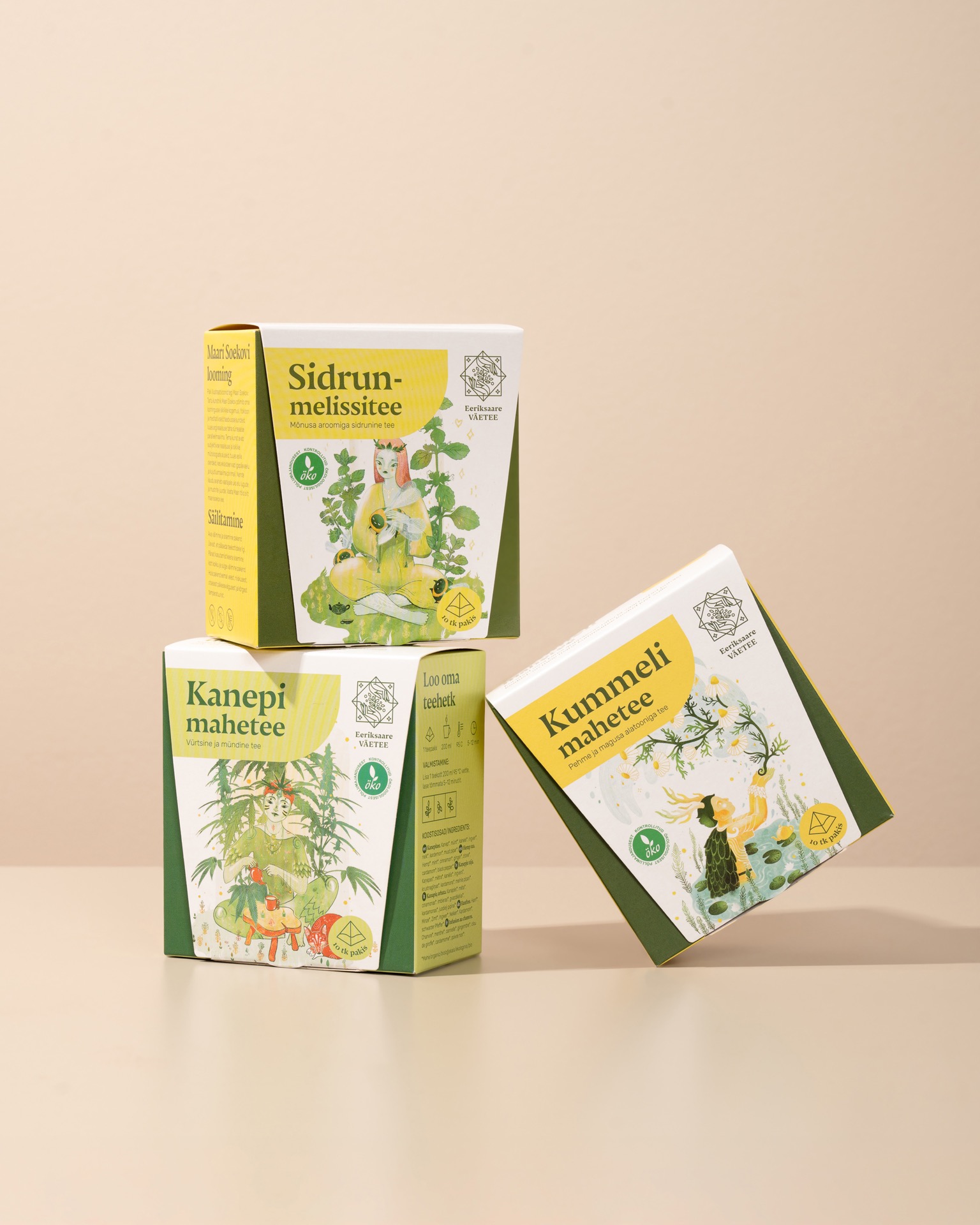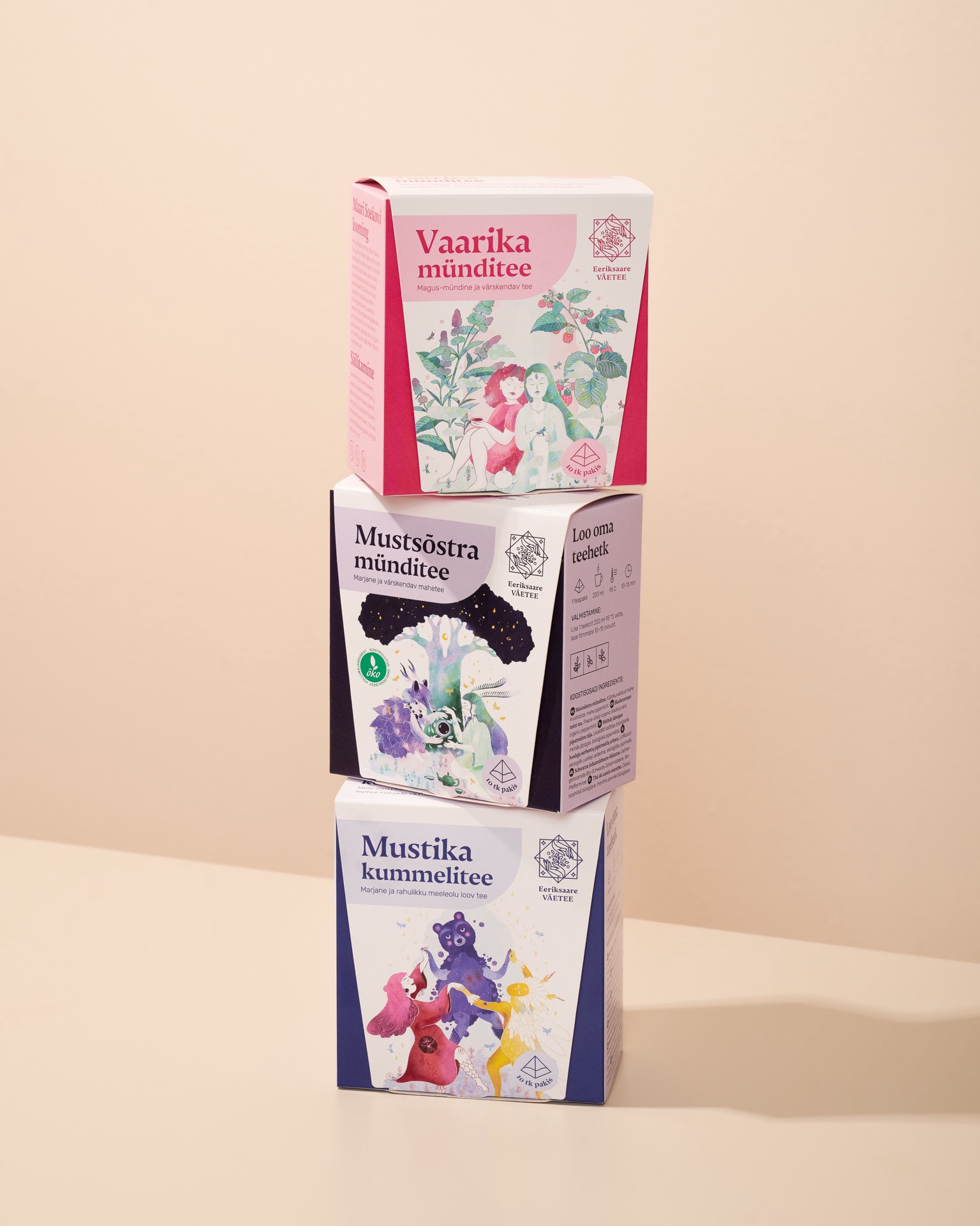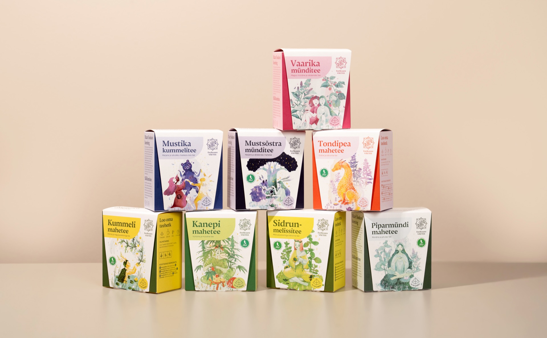 Väetee püramiidtee on loodud teadliku teerituaali toetamiseks. Eesti looduse puhtust ja mitmekesisust peegeldav maitseelamus on kujundatud omaette karakteriteks – taimede iseloom, rütm ja mõju on tõlgitud visuaalseteks tegelasteks. Kirjaümbrikust inspireeritud esikaane lõige loob avamisel isikliku ja aeglustava hetke. Eestis toodetud gurmeesari koosneb kaheksast erinevast maitsest.